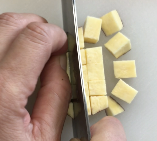 ①さつまいも200gは良く洗い、約1cm角のさいの目切りにし、水にさらす。